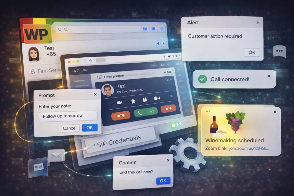 A fully featured Window API allows developers to extend and customize the Browser Phone’s interface in a controlled way. The API includes primitives such as Window, Alert, Prompt, Confirm, and Toast components, enabling extensions to surface their own UI without breaking consistency. This makes it possible to add custom workflows, notifications, and integrations directly into the phone interface, while keeping the core UI stable and predictable.